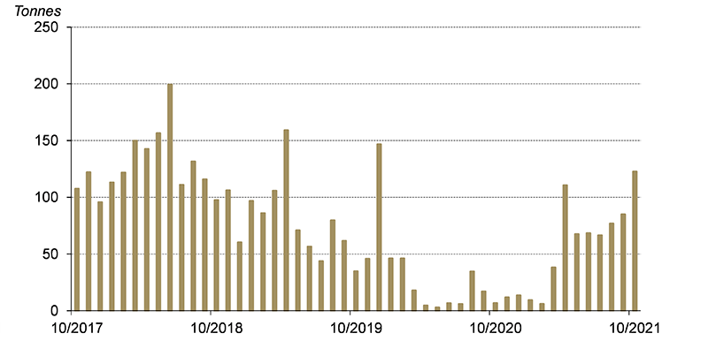 According to the latest data release by China Customs, 123t of gold flowed into China in October, 38t higher m-o-m and the highest since December 2019. China’s gold imports tend to rise in the fourth quarter due to seasonality of local demand. Y-t-d, Chinese gold imports total 651t, significantly higher than 2020.