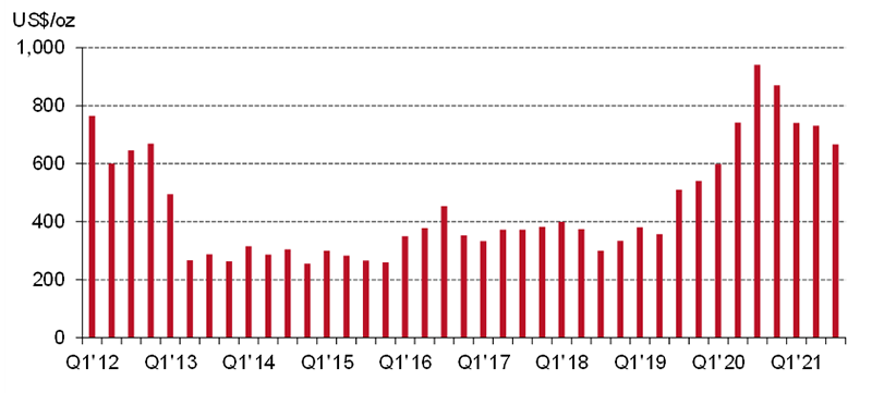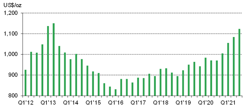 All-in Sustaining Costs (AISC) across the gold mining industry averaged US$1,123/oz in Q3’21, a rise of 4% q-o-q and the highest level since 2013. This is the fourth consecutive quarter of cost growth, with the average AISC up a significant 16% since the corresponding quarter in 2020.