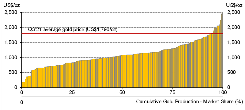 Rising costs are leading to declining margins for many gold miners, however they still remain at historically high levels. In Q3’21, the industry average AISC margin (gold price minus AISC) fell by 9% q-o-q to US$667/oz. This is the lowest margins have been since Q1’20, however prior to this they had not been above this level since Q4’12. Despite rising costs and lower margins, the gold mining industry remains in a healthy position at current gold prices. This is more apparent when looking at the industry cost curve for Q3’21, which shows that only 6% of production originated from mines with AISC above the gold price.