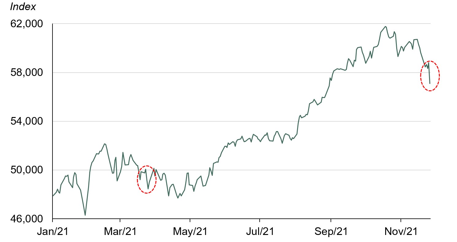 - On 26 November the BSE Sensex witnessed its biggest daily fall in the last seven months due to fears about the new COVID variant identified in South Africa and a sell-off by foreign institutional investors (FIIs) who are concerned about overvalue in the equity market