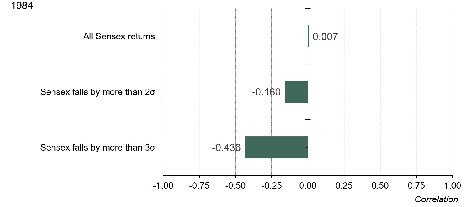 Correlation between gold and Sensex in various environments of equity performance since