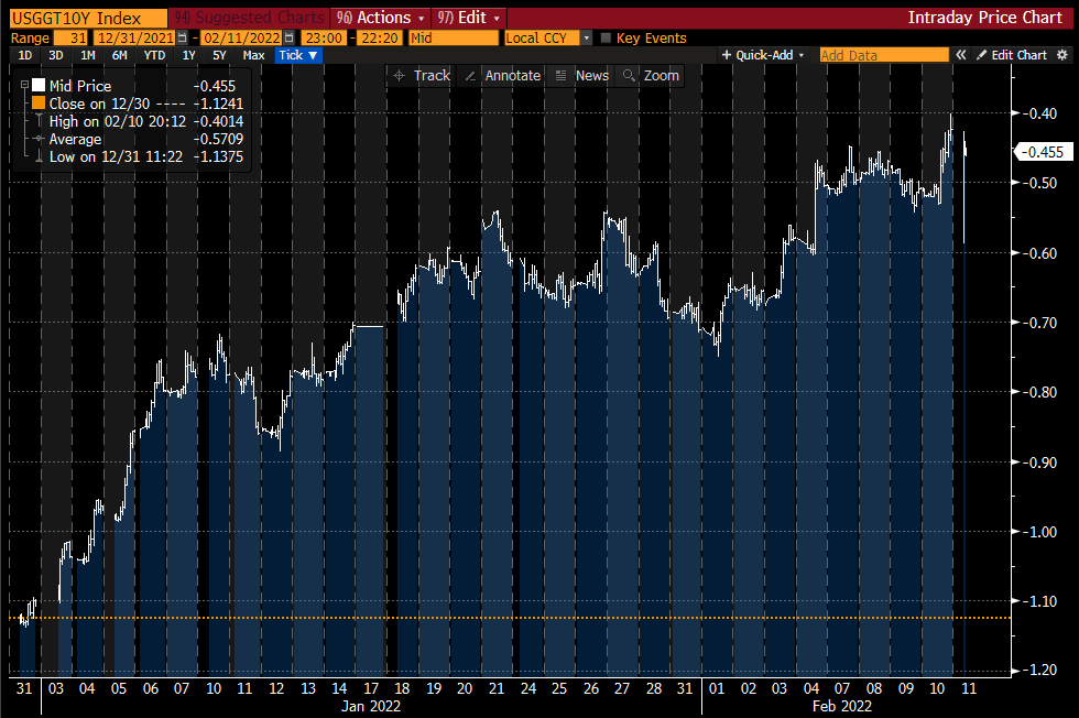 ...yet 10-year treasury yields are about 65bp higher (less negative)