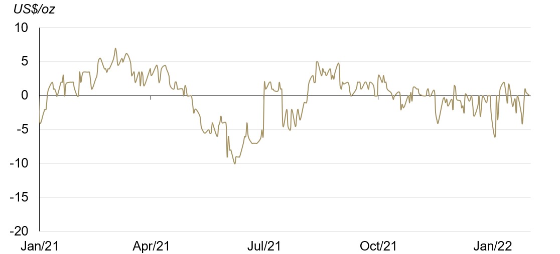 - Weak retail demand pushed the local market into a discount of US$1-2/oz during the first two weeks of the month, which widened to US$2-3/oz by month-end