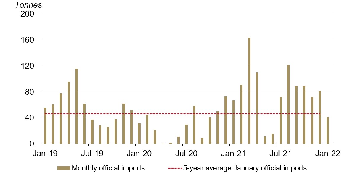 - With no change to the tax rate on gold imports and the easing of restrictions, we anticipate that official imports should bounce back in February.