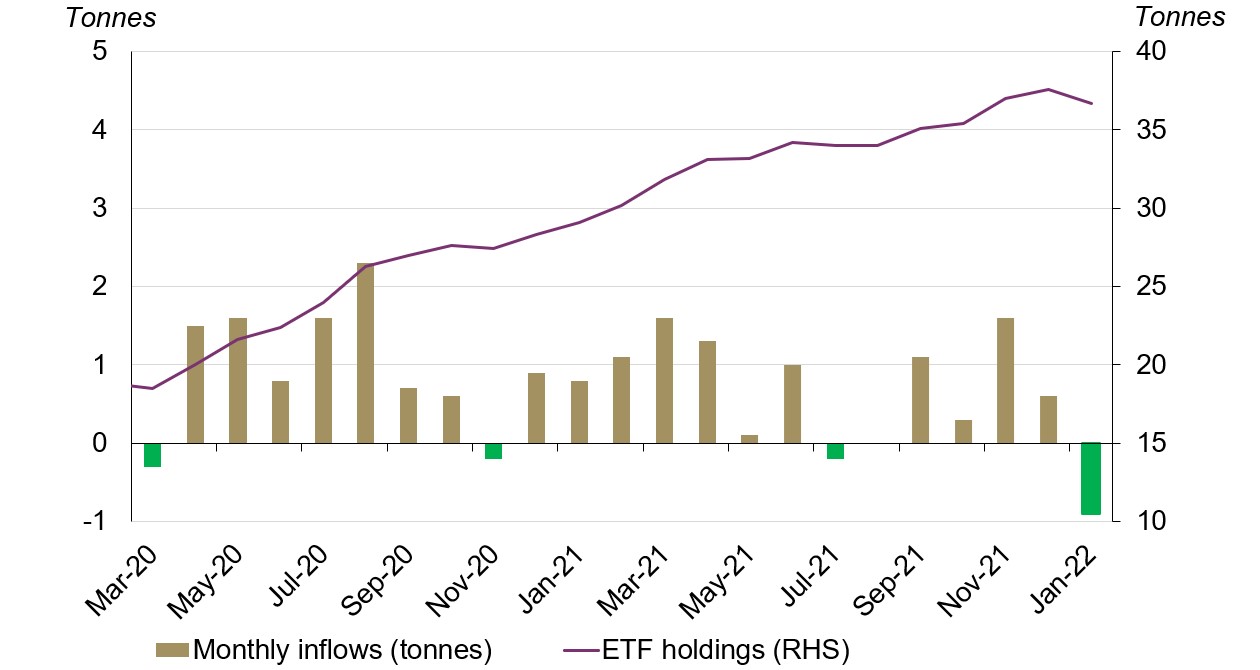 Indian gold ETFs saw outflows of 0.9t (Rs5.7bn, US$76mn) in January, the first monthly outflows since July (0.2t). This was primarily driven by rising 10-year Indian government bond yields and expectations of a more hawkish Fed stance. Net January outflows took total gold holdings to 36.7t by the end of the month (Chart 3).