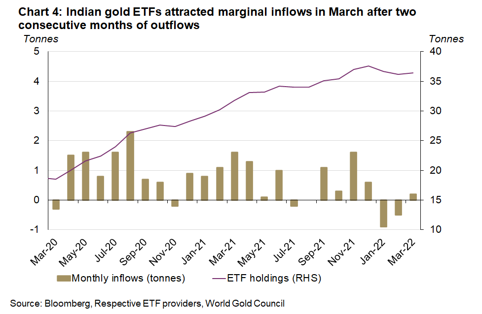 - Indian gold ETFs witnessed marginal net inflows of 0.2t in March, primarily driven by a correction in the gold price, which might have spurred investor interest; total holdings of gold ETFs were 36.4t2