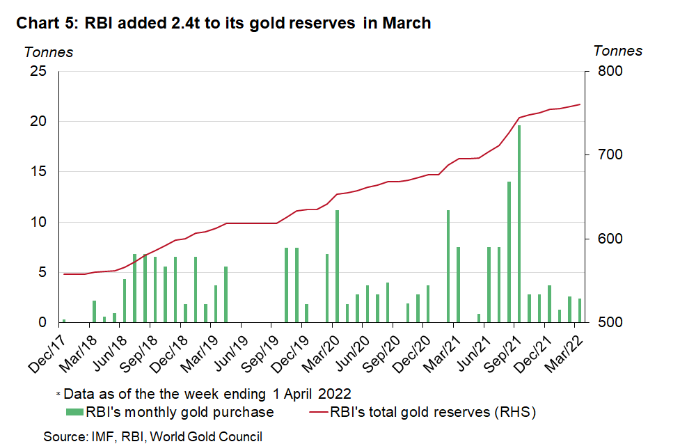The RBI’s gold purchases increased in March by a marginal 2.4t, slightly below the 2.6t bought in February. This took total gold reserves to 760.4t by the end of March (Chart 5).9 India’s foreign exchange (fx) reserves slumped by US$11.17bn in the week ending 1 April to US$606.48bn – the steepest weekly fall – due to higher crude oil import prices as a consequence of the war in Ukraine. This steep fall in fx reserves meant that gold’s share of total reserves rose to 7.8% in March from 7.3% in February.