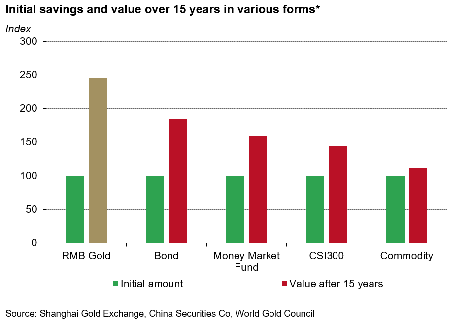While savings are often in the form of bank cash deposits – savers see banks as stable and can readily access their funds – we believe that gold could also benefit savers. RMB gold has offered a compound annual growth rate of 6% during the past 15 years, higher than other assets including money market fund and government bonds.