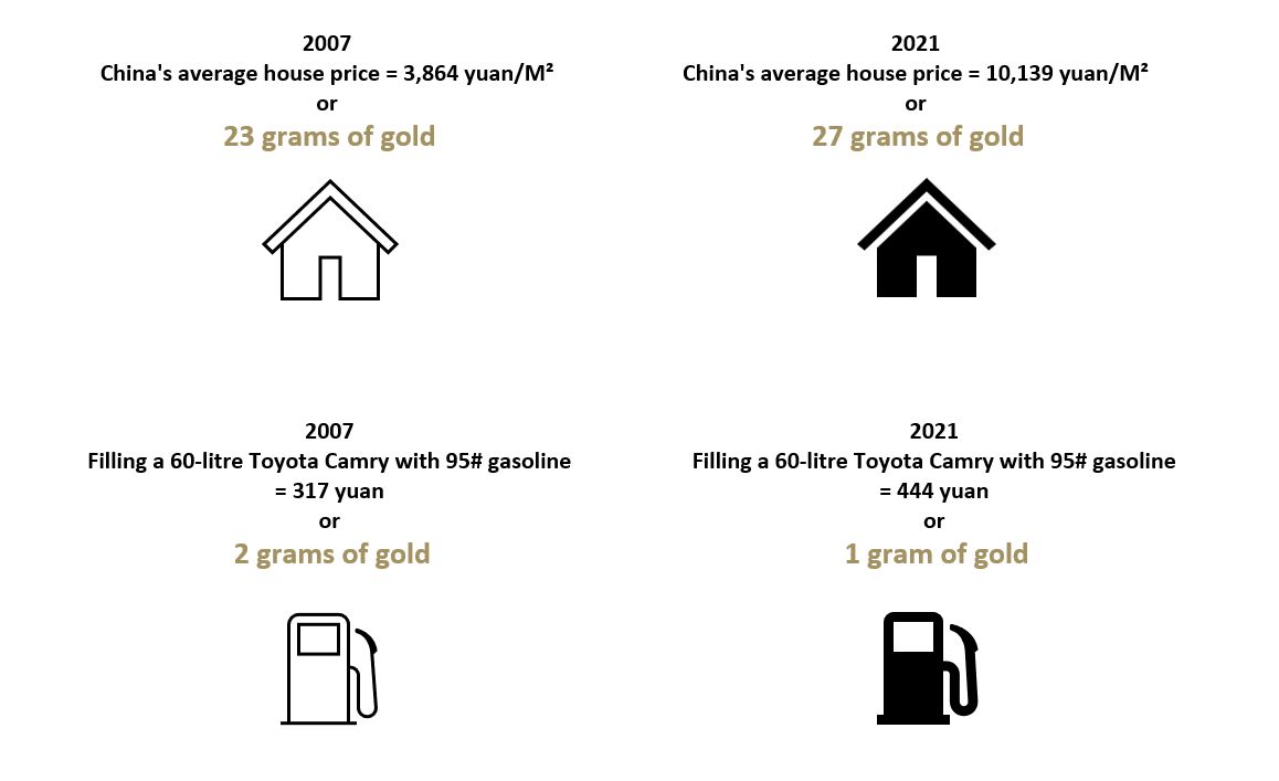 *Based on the annual average Au9999 price, the annual average property price in China and the annual average 95# gasoline retail price in Shanghai, between 2007 and 2021 due to data availability.