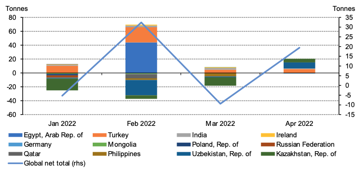 *Data to 30 April 2022. Note: Japan’s reported 81t increase in its gold reserves in March 2021 has been excluded as this was the culmination of an off-market transaction between two different divisions within the Ministry of Finance.