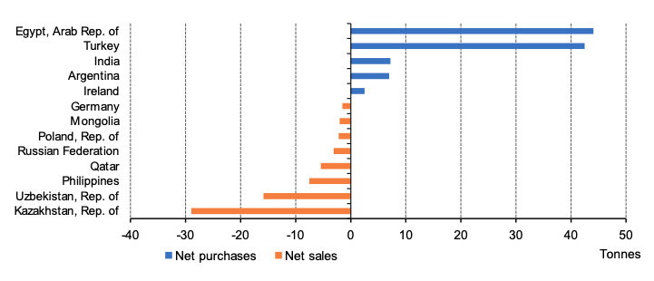 Gross sales were limited to small number of central banks. Germany (-0.9t) was the notable seller in the month – likely related to coin-minting. Mexico (-0.1t) and Czech Republic (-0.1t) were other minor sellers in the month.