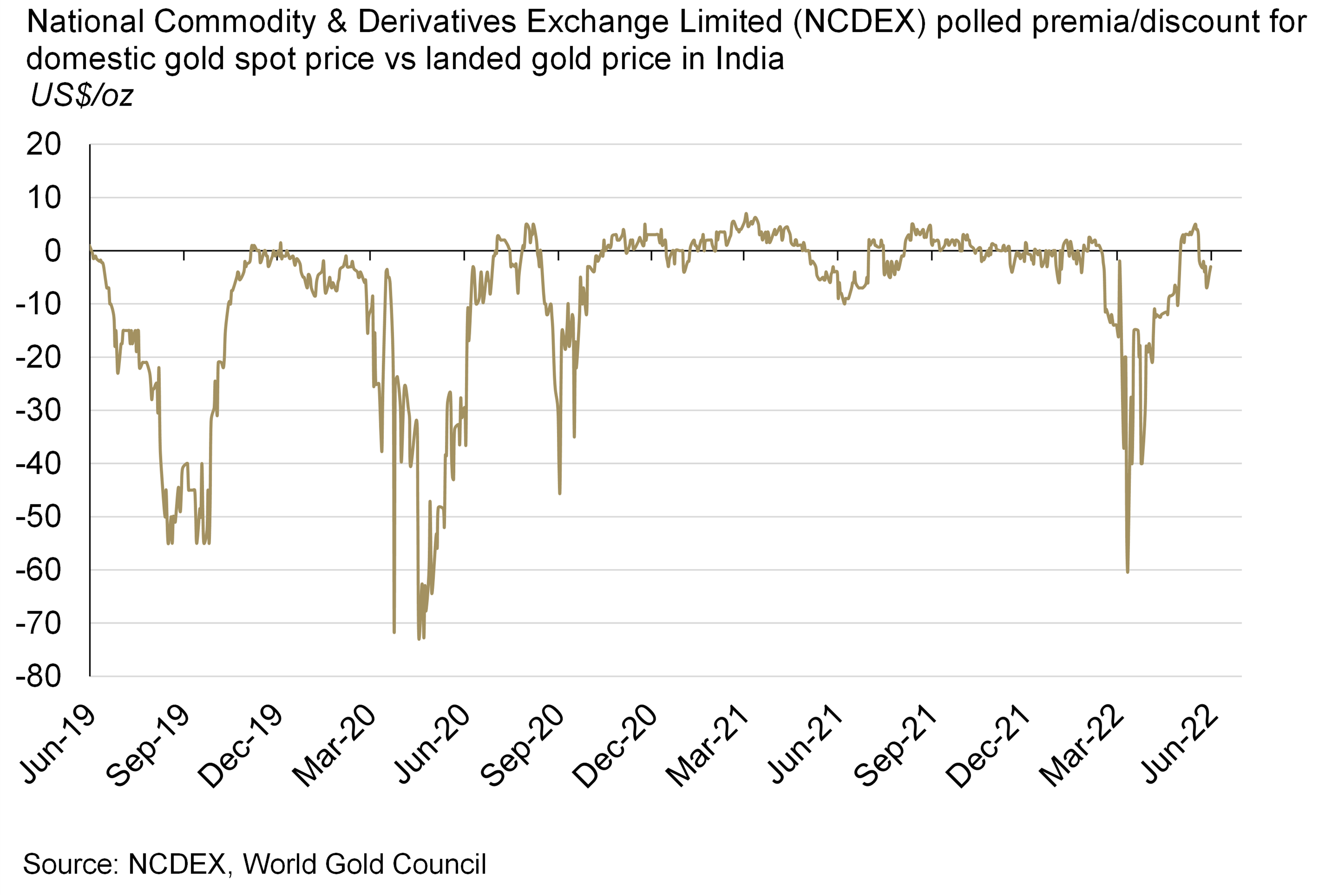 - The higher custom tariff of US$597/10gm – which applied during the first two weeks of June – resulted in a higher landed cost of gold