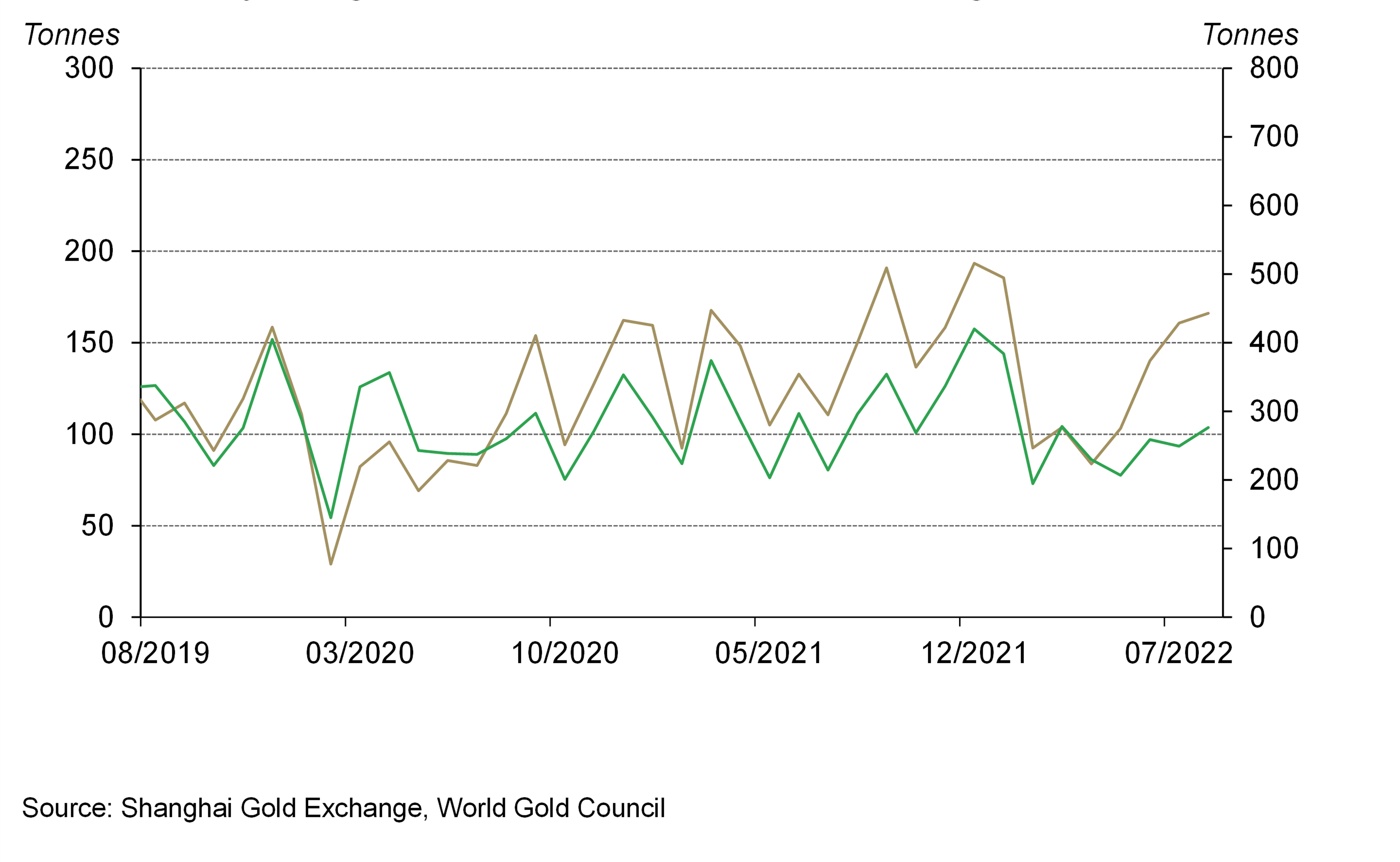 - Seasonal strength and robust consumption supported gold withdrawals from the Shanghai Gold Exchange (SGE) in August, witnessing both m-o-m and y-o-y rises.
