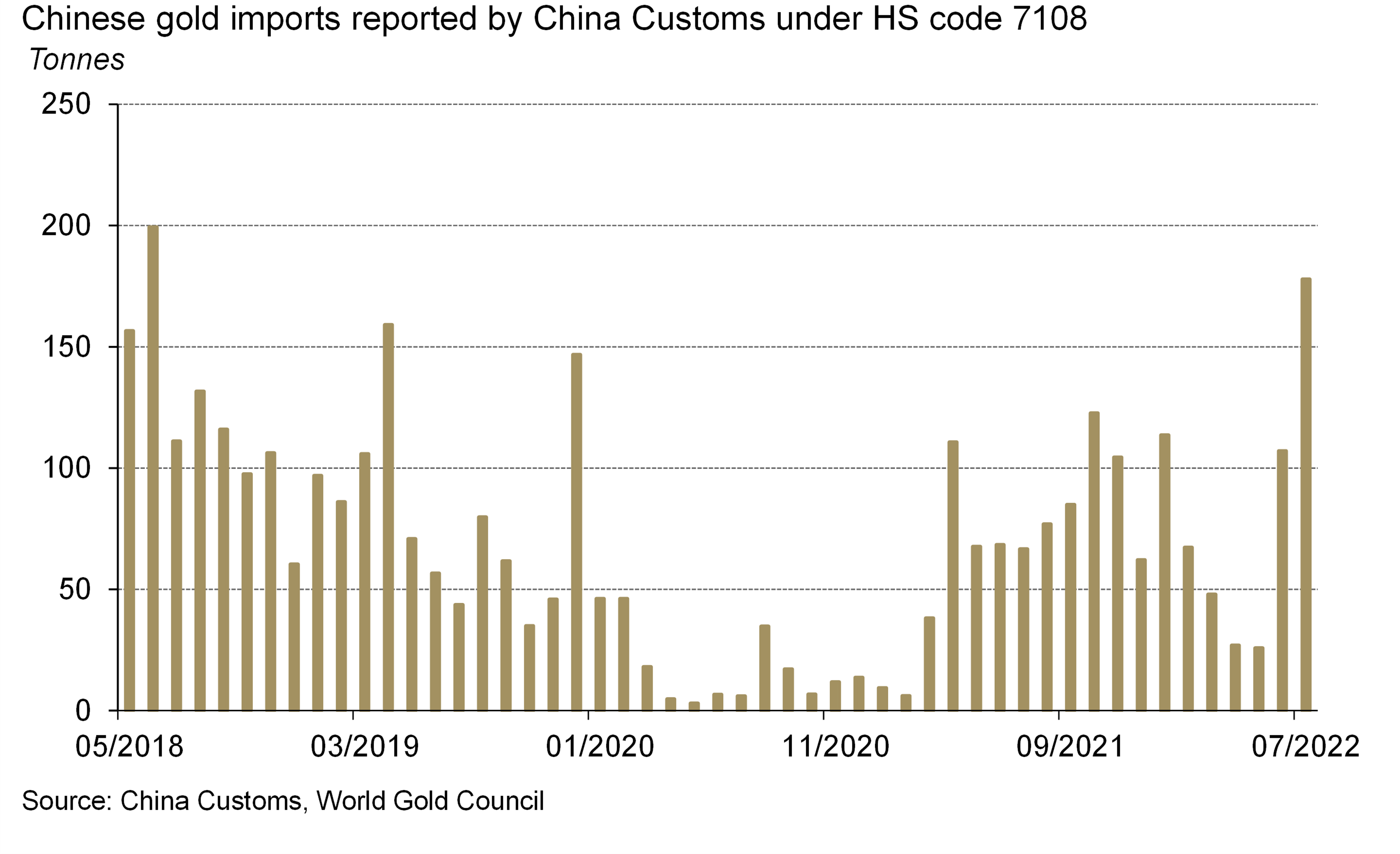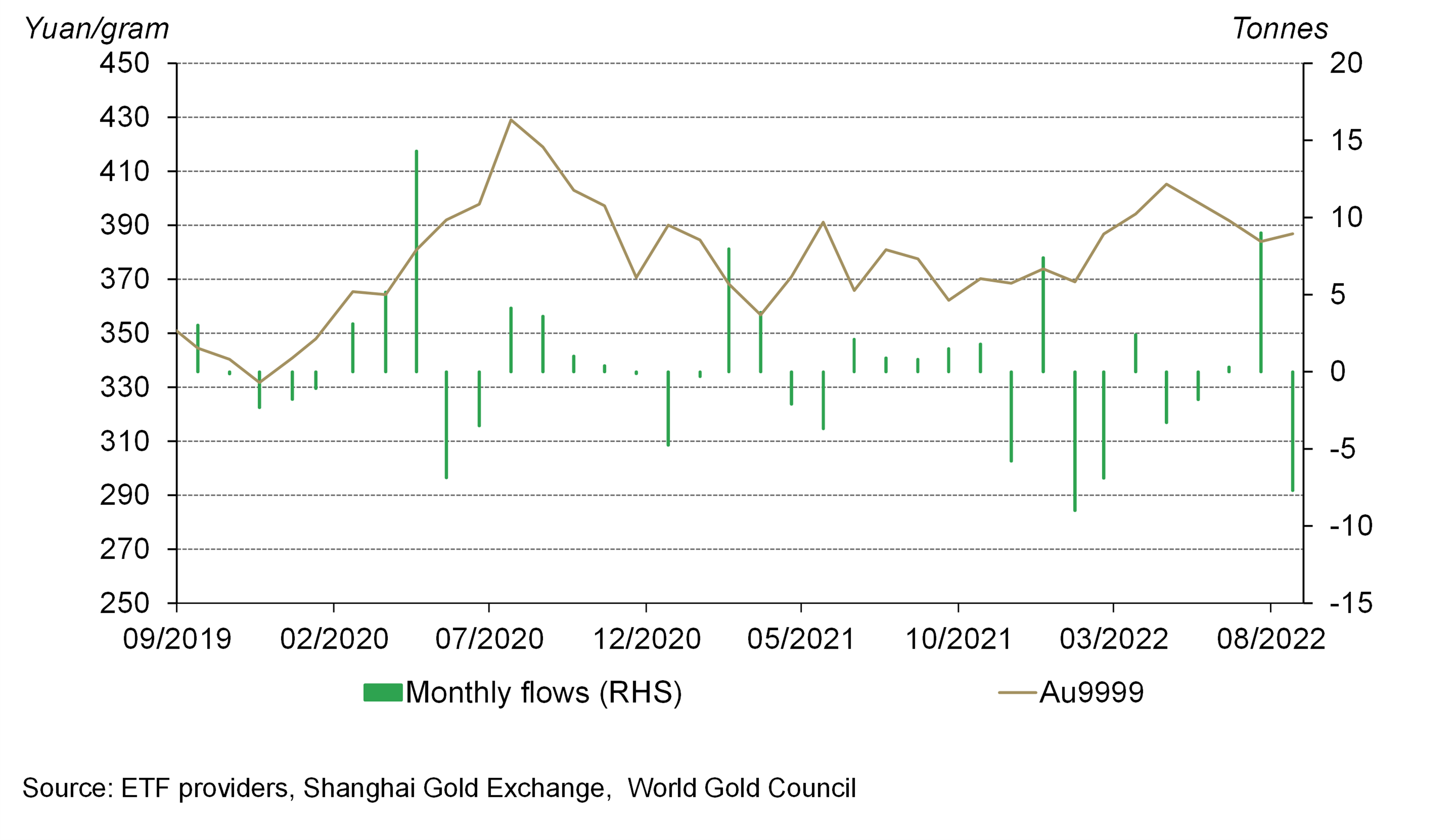 - Total assets under management of Chinese gold ETFs stood at 58.3t (US$3.3bn, RMB22.6bn) at the end of August, a 7.7t (US$485mn, RMB2.8bn) outflow over the month.2