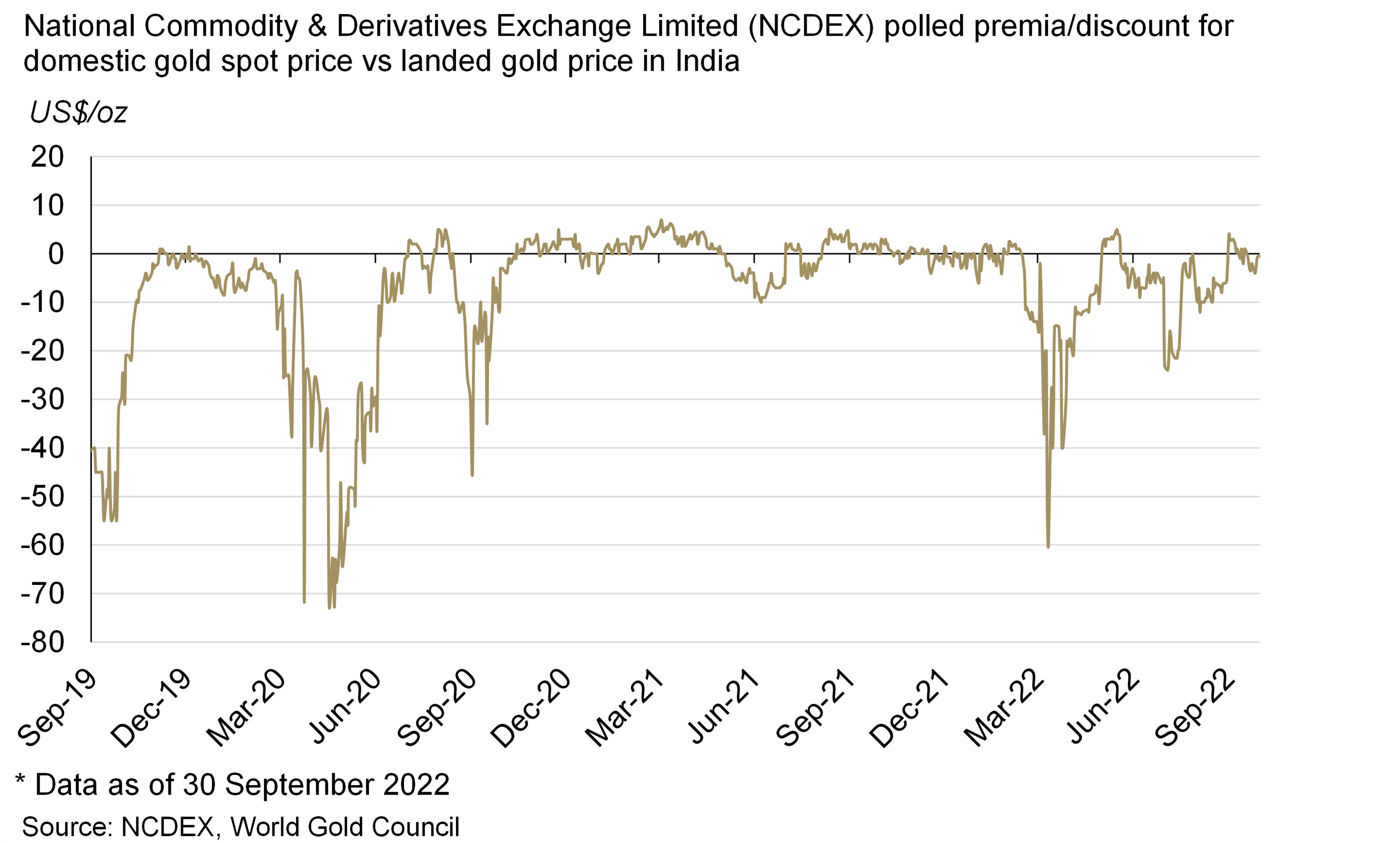 The local gold price pullback proved to be a boost to Indian retail demand, pushing the local market back into a premium of US$2−3/oz during the first week of September – the first time it has been in premium since May 2022. The market, however, dropped back into discount for the rest of the month (Chart 1)5 due to: