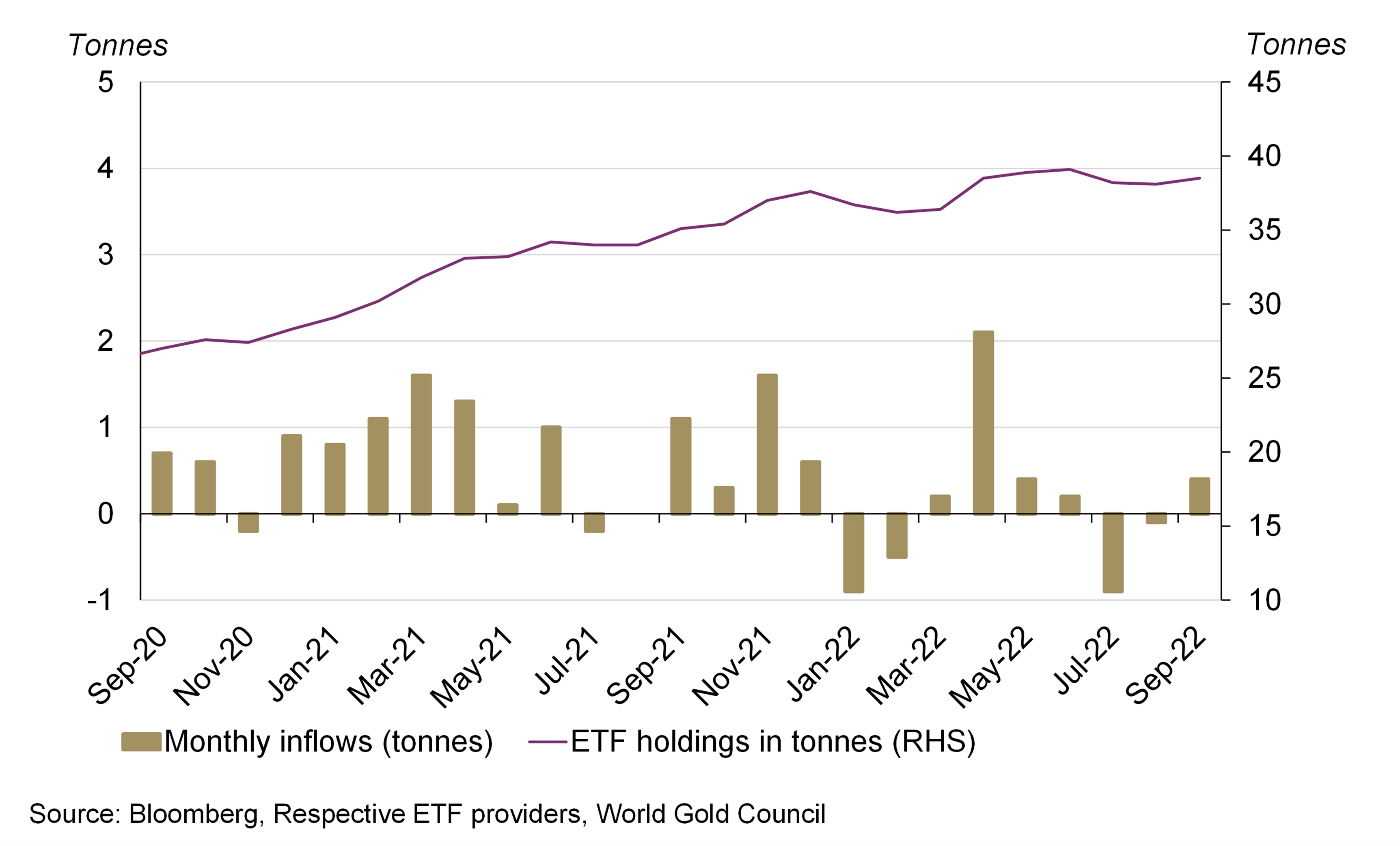- Indian gold ETFs witnessed a marginal net inflow of 0.4t in September as a domestic gold price correction enticed investors back into gold