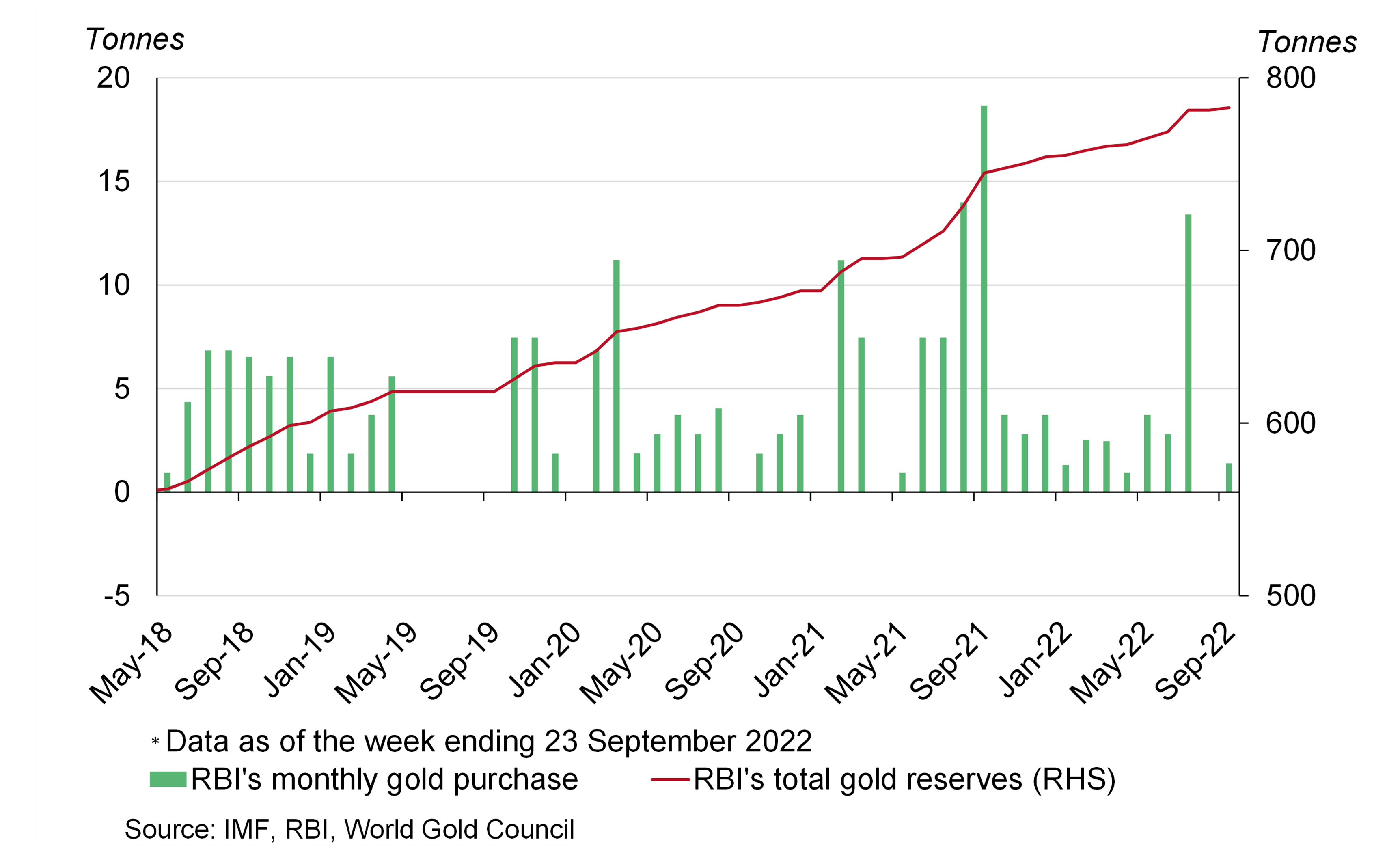 - The Reserve Bank of India (RBI) added 1.4t of gold to its reserves in the first three weeks of September, lifting its total gold reserves to 782.7t.1