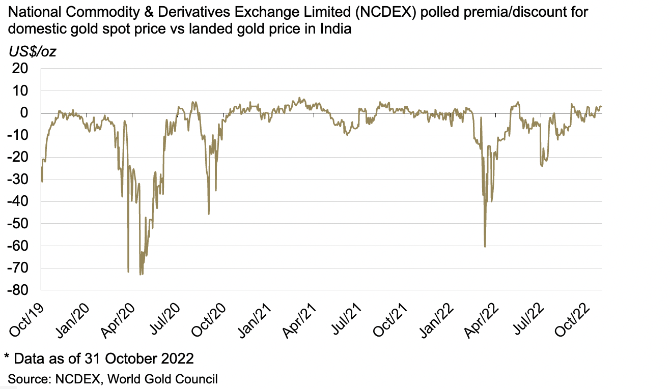 The premium/discount data is based on the gold premium polled spot price from National Commodity & Derivatives Exchange Ltd.