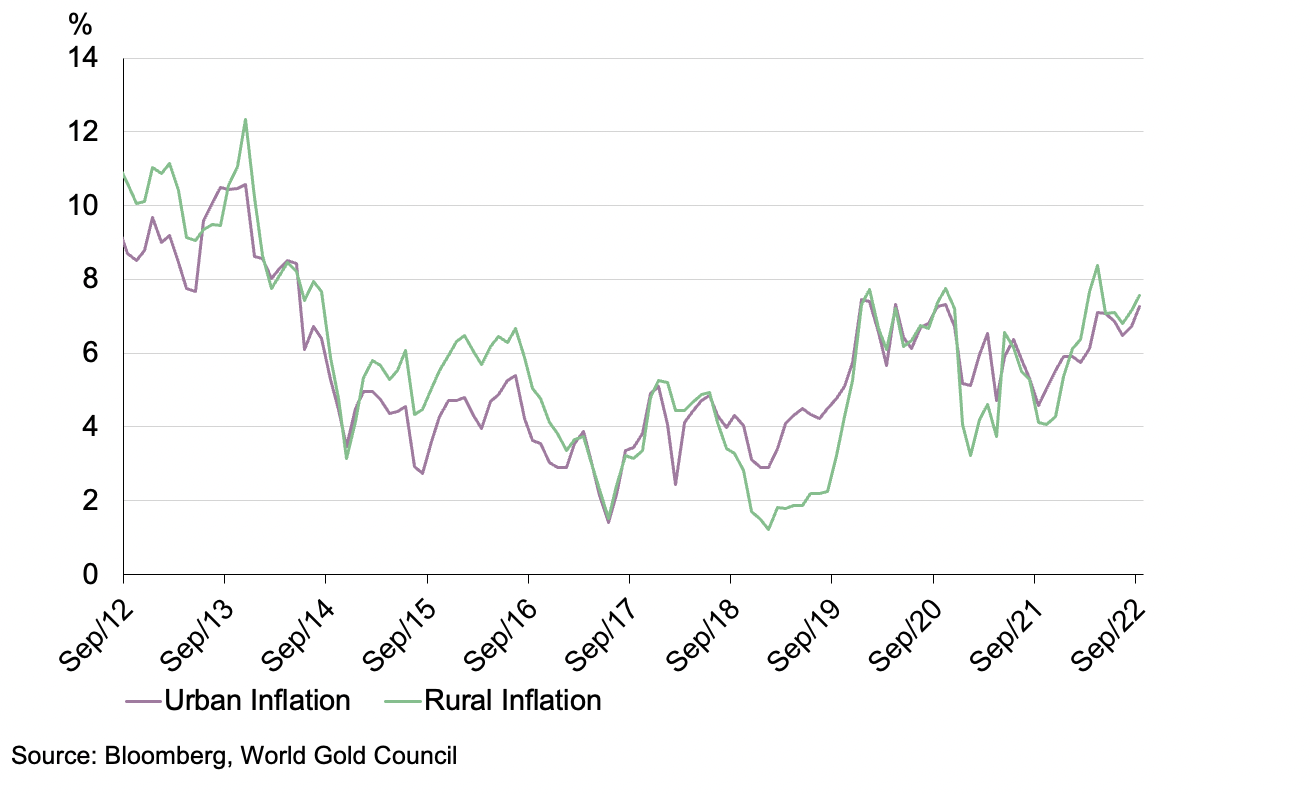 October retail demand remained strong with the onset of festivals and weddings. The festivals of Dussehra and Dhanteras sparked fresh demand for physical gold towards the end of the month. Dhanteras was celebrated on two days this year (22 and 23 October) and with a stable gold price before this date, demand received a boost from sales of jewellery (for weddings and everyday wear) as well as bar and coin purchases. Dhanteras purchases received support from the recovery in urban sentiment, although rural demand was impacted due to a 4% higher y-o-y domestic gold price and relatively high levels of inflation compared to urban areas (Chart 2). Based on our interactions with the trade, demand during the lead-up to Dhanteras was ~10-15% higher y-o-y in volume terms, indicative of the strong sentiment this year, particularly when we consider that last year’s festival demand was also robust.