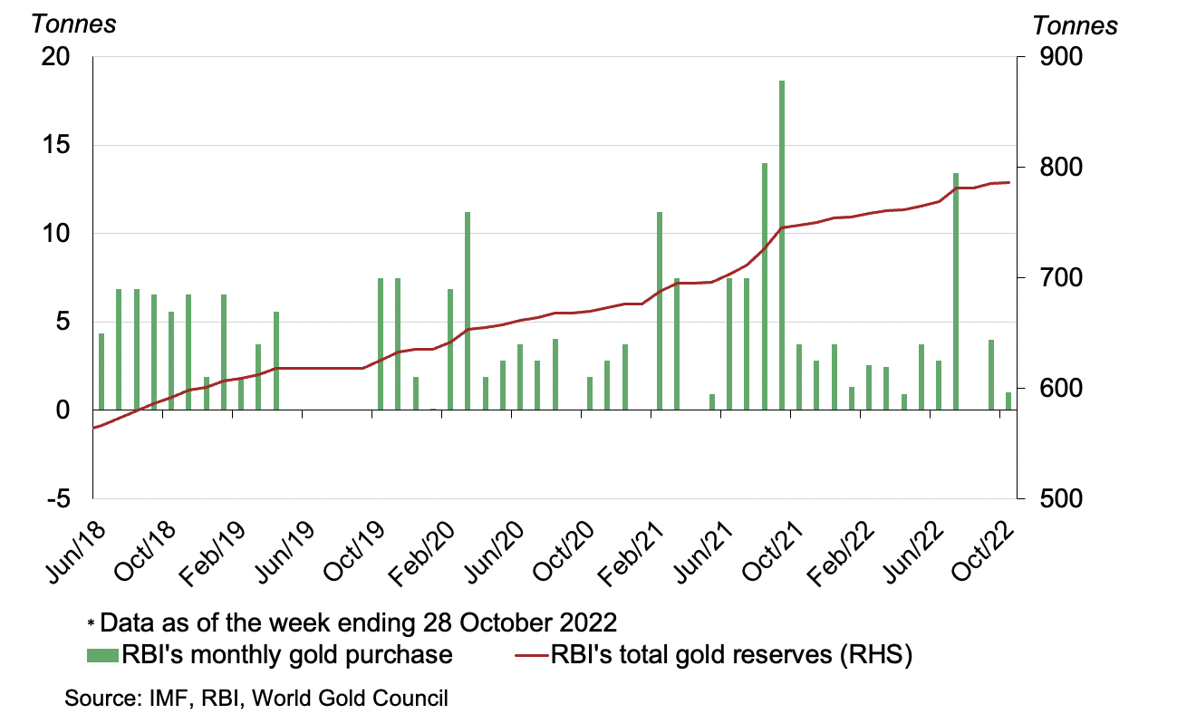 RBI’s gold reserves as a percentage of total reserves increased to 7.7% in October from 6.9% in December 2021. The FX reserves of US$538bn are based on data for the week ending 28 October 2022.