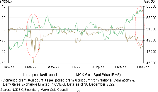 - The domestic gold price increased by 3.8% in December, ending the month at Rs54,556/10g1 and ending 2022 with a solid 14% gain; stronger than its peer in USD due to the weaker INR