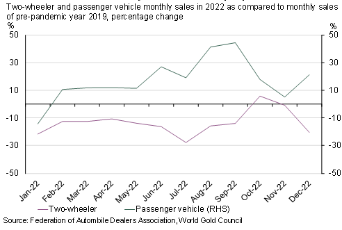 The international gold price shot up by 3% in December to US$1,812/oz, supported by expectations of a less-hawkish US Fed in the light of lower yields and dollar weakness.3 Gold’s performance was relatively strong in local currency terms (+3.8% m-o-m) as the INR depreciated by 1.4% against the USD during the month.