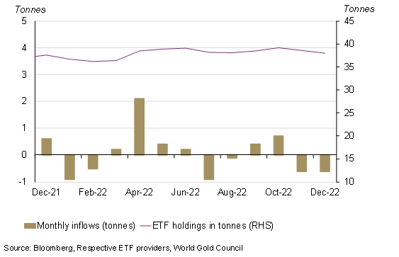 - Indian gold ETFs witnessed marginal net outflows of 0.6t in December – as investors booked profits following the domestic gold price rise – and ended 2022 with an overall marginal inflow of 0.4t for the year