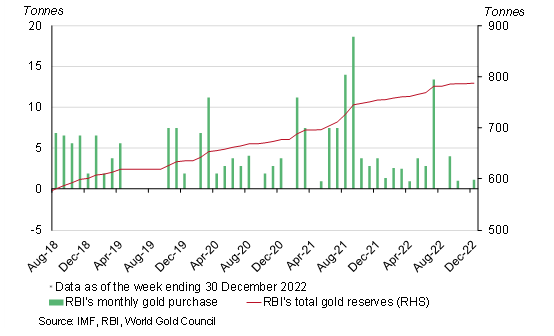 - The Reserve Bank of India (RBI) added 1.1t to its gold reserves during the month, increasing its total gold reserves to 787.4t.2 The RBI added 33.3t to its gold reserves in 2022 – 76% lower y-o-y.