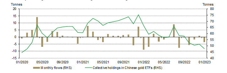 - Chinese gold ETF holdings totalled 48t (US$3bn, RMB$20bn) at the end of January, the lowest since February 20201