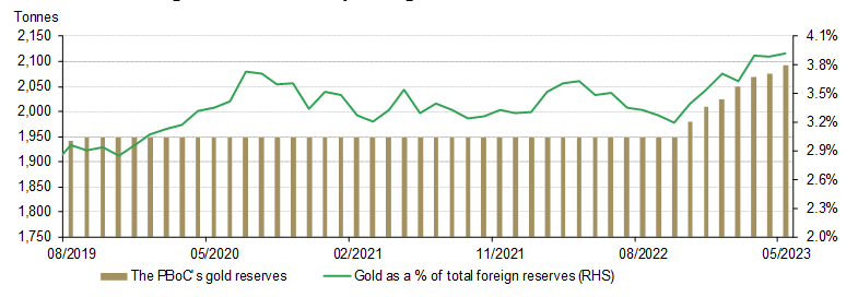 May saw another reported increase in China’s gold reserves to 2,092t, a 16t rise during the month and the seventh consecutive reported purchase. During the seven-month period, China’s gold reserves gained 144t. Gold’s share of China’s total foreign exchange reserves remained stable at 3.9% (Chart 6).