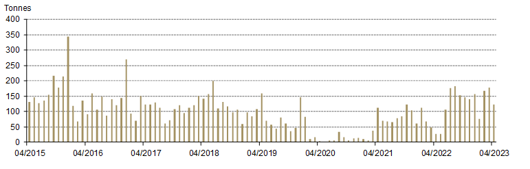- Gold imports fell to 124t in April (-54t), primarily driven by seasonality and the lower local gold price premium.