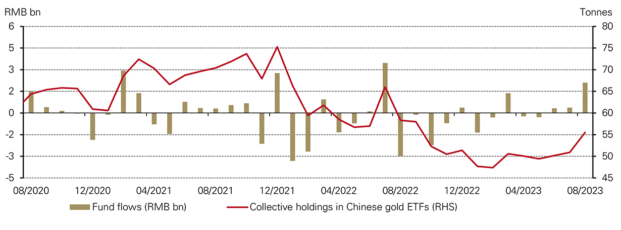 - Chinese gold ETFs saw the third consecutive monthly inflow, adding RMB2bn (+US$293mn) in August and pushing their total assets under management (AUM) to RMB26bn (US$4bn)
