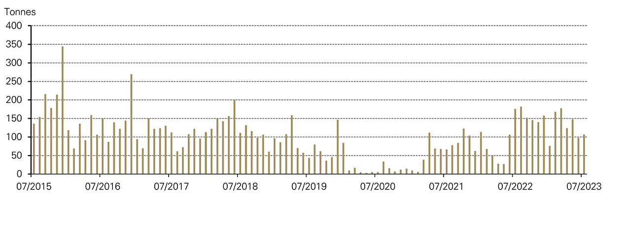 China imported 107t of gold in July, based on the most recent data release from China Customs. July’s imports were 9t higher m/m, a slight change from the previous month amid off-season demand patterns. Compared to July 2022, there was a 69t fall, which was also a reflection of the y/y demand weakness as we previously noted.