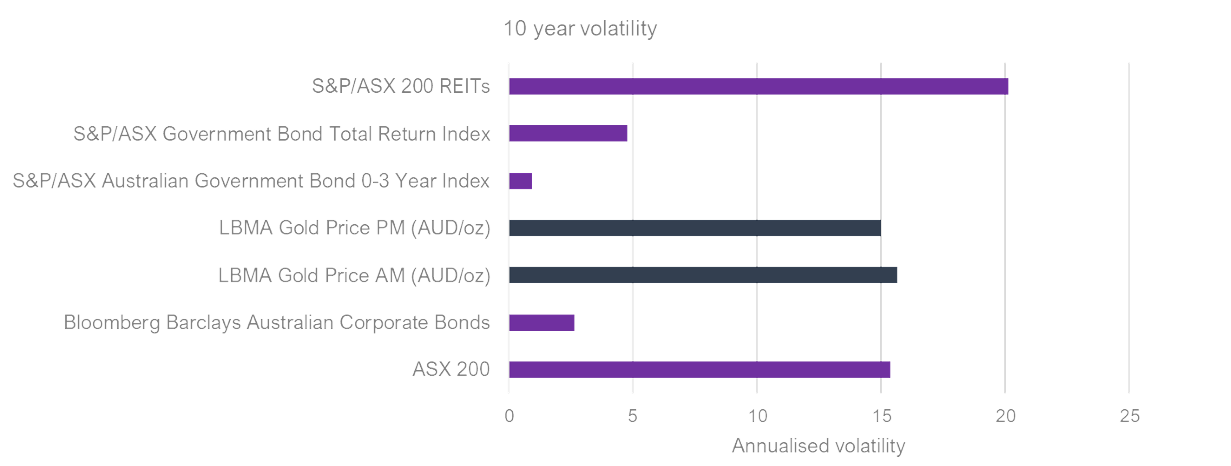 Investment demand (38%) can over the short term, exert strong pressure on gold’s price. This type of tactical demand from physical markets, exchange-traded securities and over-the-counter (OTC) products has historically experienced increases during periods of economic and political uncertainty, and falls as confidence grows. As gold is one of the most active daily traded assets, there is a tendency to suggest that it is highly volatile. Yet, in reality, over the medium to long-term, it is less volatile than Australian Real Estate Investment Trusts, and on par with the ASX 200.