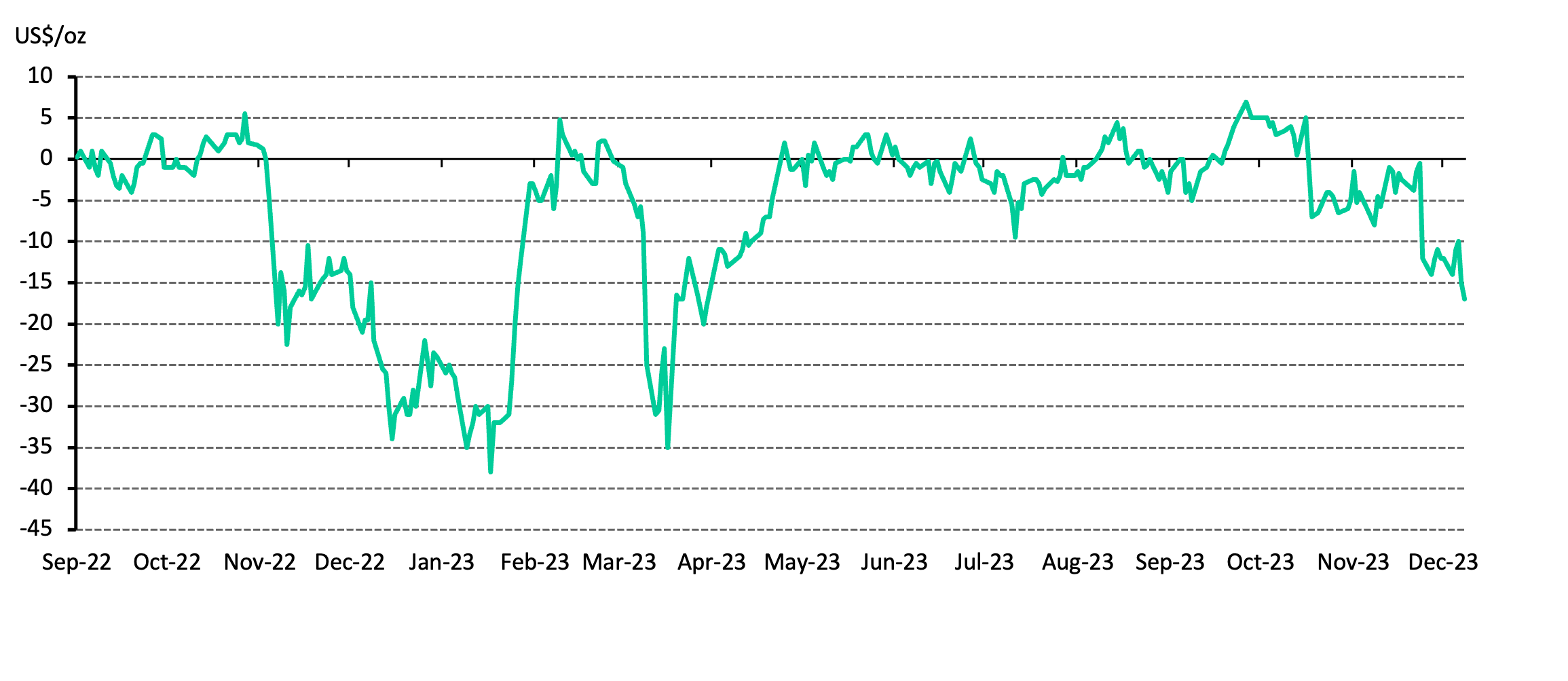 Physical demand for gold across various regions is being impacted by the surge in global prices.11 In China too, premiums although still elevated have narrowed from the highs of September 2023 (US$75/oz to US$44/oz), indicative of the local demand and supply conditions.12