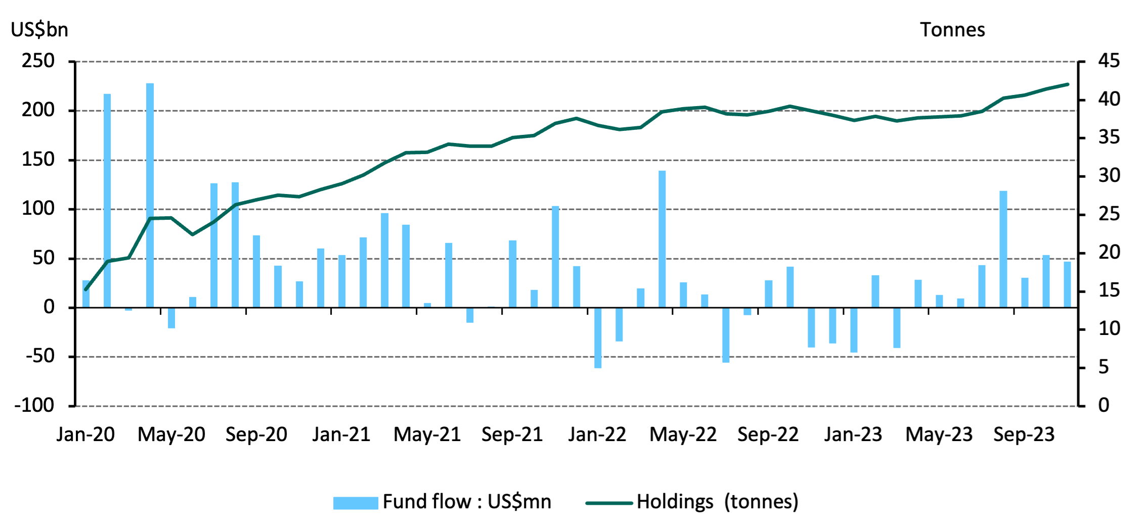 Indian gold ETFs continue to attract inflows. November marks the eighth consecutive month of net inflows, although lower than October inflows by US$6.6mn (12.3%). Fund inflows (net) totalled US$46.6mn at the end of November 2023. Y-t-d, Indian ETFs have recorded net inflows of US$289mn, a more than fourfold increase from the net inflows of US$69mn in the comparable period of 2022, reflecting the growing investor interest in gold that has been supported by its strong price performance.