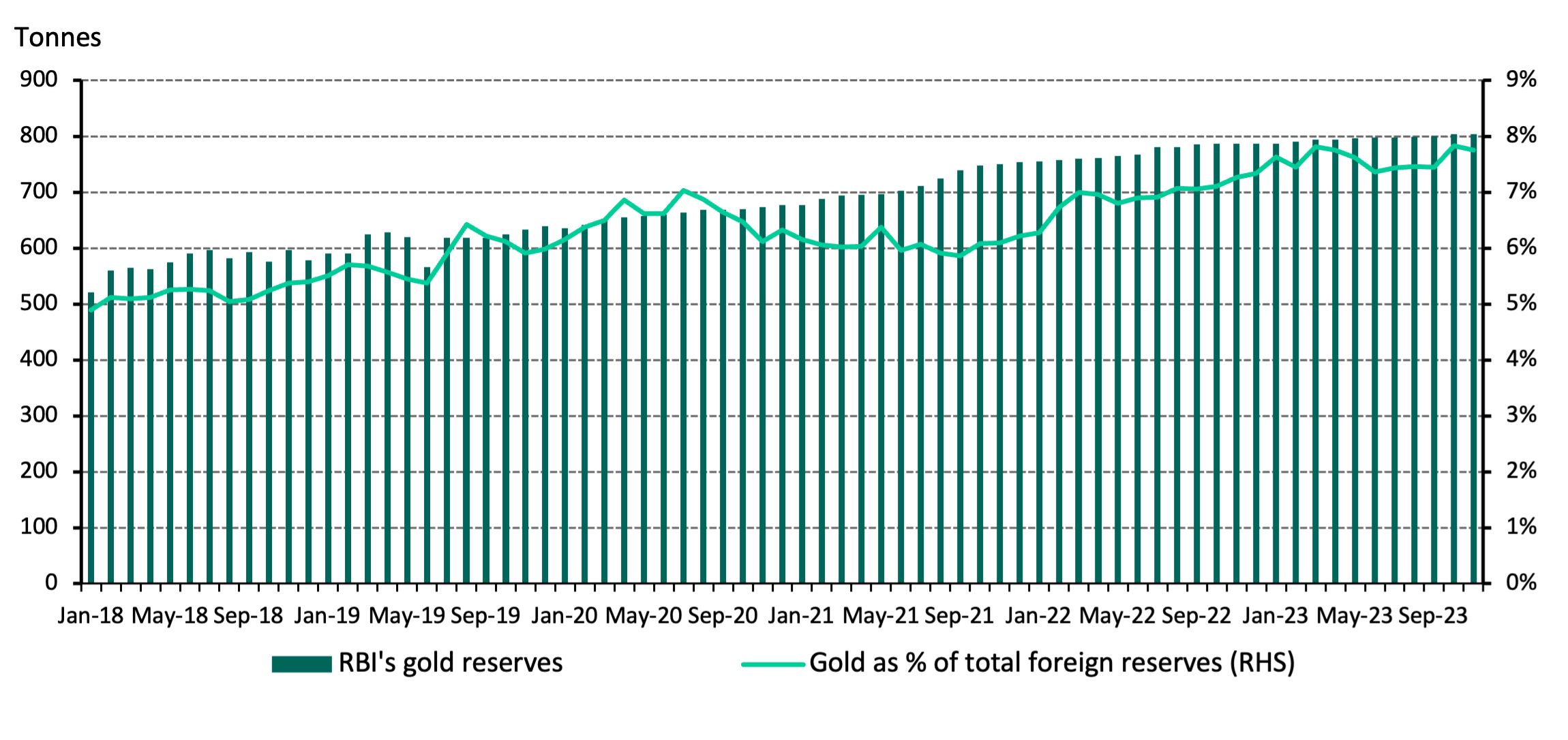 Chart 4: RBI adding to gold reserves, albeit gradually