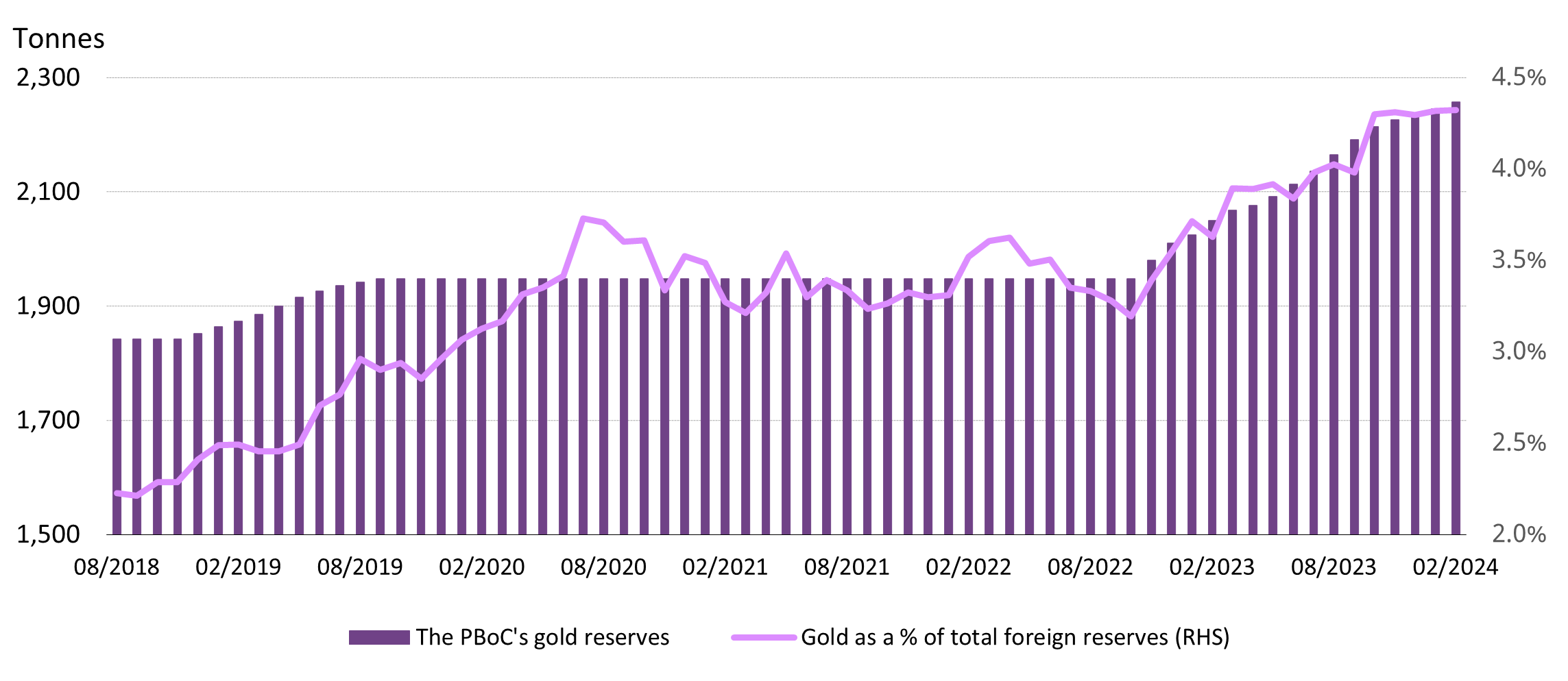 At the end of February gold accounted for 4.3% of China’s total foreign exchange reserves, up from 3.4% in November 2022, the time at which the PBoC resumed its gold purchase announcements.