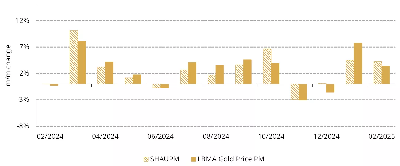 - Gold’s strength sustained: during the period from 27 January to 28 February 2025 – taking account of the Chinese New Year’s (CNY) holiday1 – the LBMA Gold Price PM was up by 3.4% and the Shanghai Benchmark Gold Price PM (SHAUPM) rose by 4.3%2