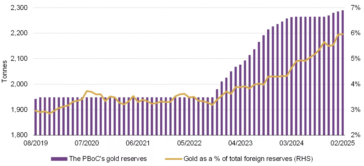 The PBoC reported another 5t gold purchase in February, the fourth consecutive month of gold reserve increases (Chart 5). At the end of February China’s official gold holdings stood at 2,290t, the highest on record, accounting for 5.9% of total foreign exchange reserves. During the first two months of 2025 Chinese gold reserves increased by 10t in total.