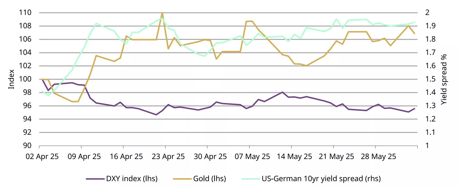 More recently, consumer confidence and business investment intentions have been affected by economic and trade policy uncertainty. This in turn has triggered a reallocation of global capital out of the US with global investors seeking out alternative safe-haven assets to US Treasuries. The consequences have been a weaker dollar, rising gold prices, and US bond yields widening versus other high-grade sovereigns, e.g. Germany (Chart 3).