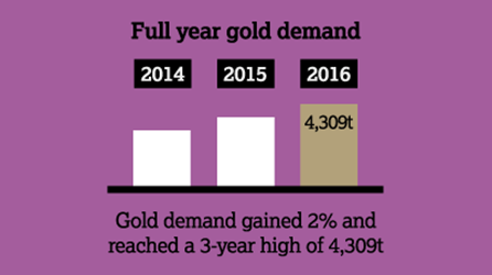 2016 full-year gold demand gained 2% to reach a 3-year high of 4,308.7t. Annual inflows into ETFs reached 531.9t, the second highest on record. Declines in jewellery and central bank purchases offset this growth. Annual bar and coin demand was broadly stable at 1,029.2t, helped by a Q4 surge.