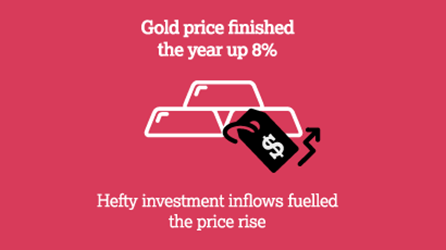 The gold price ended the year up 8%. Having risen 25% by the end of September, gold relinquished some of its gains in Q4 following Trump’s conciliatory acceptance speech and the FOMC’s interest rate rise.