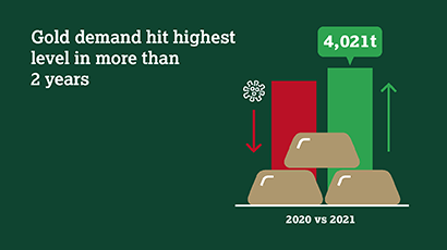 Full year 2021 gold demand (excluding OTC) increased to 4,021t, propelled by Q4 demand which jumped almost 50% to a 10-quarter high.1 Demand recouped much of the COVID-related losses sustained during 2020. Demand for gold in the consumer-driven jewellery and technology sectors recovered throughout the year in line with economic growth and sentiment, while central bank buying also far outpaced that of 2020. Investment demand was mixed in an environment of opposing forces: high inflation competed with rising yields for investors’ attention.