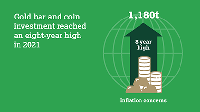 Bar and coin investment maintained its momentum, jumping 31% to an eight-year high of 1,180t. Q4 2021 demand of 318t, meanwhile, was the highest for a fourth quarter since 2016.