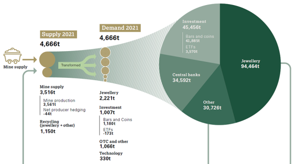 Meanwhile, central bank buying offered further reinforcement, particularly through the first three quarters of the year. A few large-scale purchases by banks including Thailand and Brazil added to the regular buying of smaller amounts by the likes of India and Uzbekistan to generate more than 460t of buying in 2021.