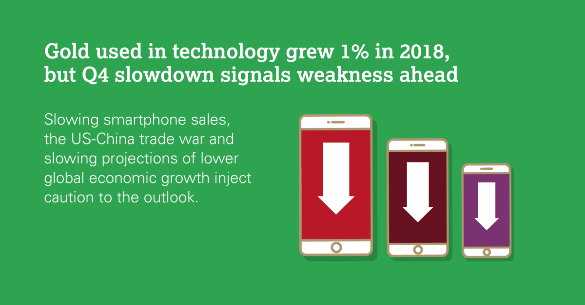 After climbing 1% to a four-year high of 334.6t, gold used in technology fell to 84.1t in Q4, the first y-o-y fall in quarterly demand since Q3 2016. Slowing growth in some major economies combined with the ongoing trade dispute dampened electronics demand.