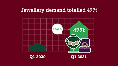 While the average gold price in Q1 was 13% higher y-o-y, it declined by 4% q-o-q.1 The opportunity to buy at lower prices, relative to the highs seen last year, boosted consumer demand, particularly as many markets continued to emerge from lockdown and economic recovery lifted sentiment.