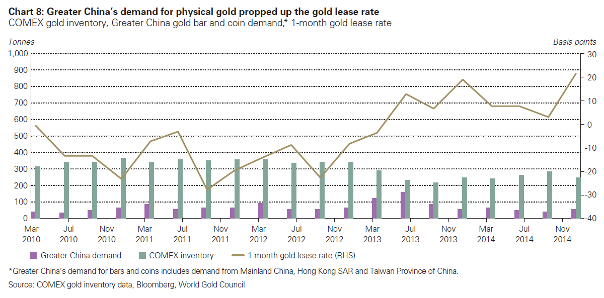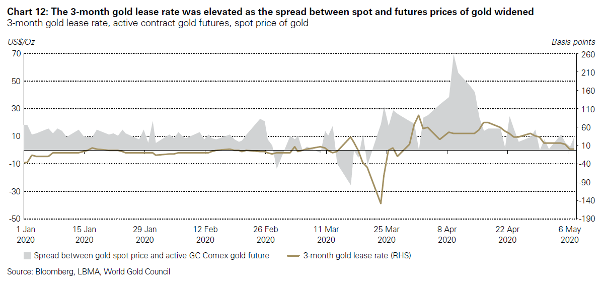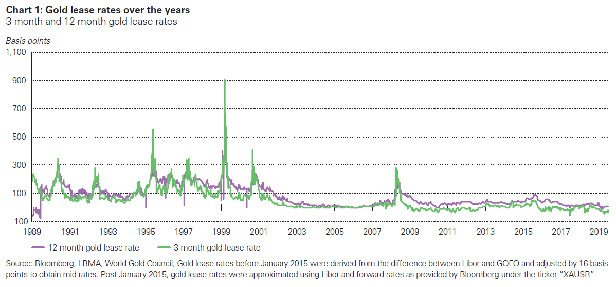 In their paper “On the Lease Rate, the Convenience Yield and Speculative Effects in the Gold Futures Market”, authors Barone-Adesi, Geman and Theal found that gold bullion inventories held by COMEX market-making members are negatively related to gold lease rates. Specifically, they found that bullion leases of 1-month duration have a strong impact on inventory levels due to lease repayments in bullion that would cause inventory levels to fall.