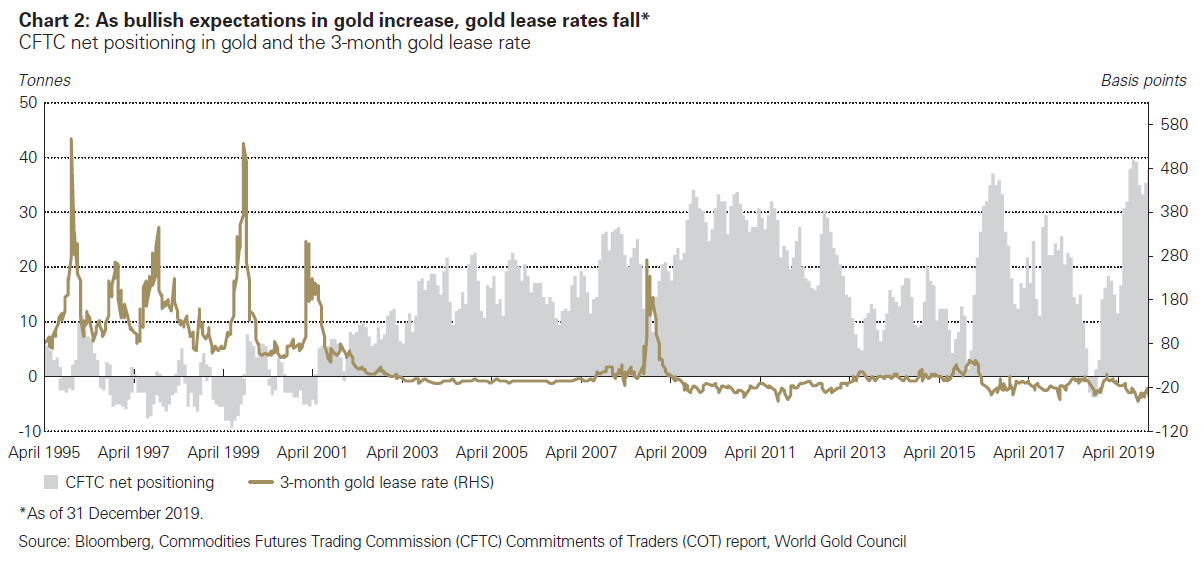 Levin and Wright (2006) found that gold prices are negatively correlated to gold lease rates. See: Levin, E.J. and Montagnoli, A. and Wright, R.E. (2006) “Short-run and long-run determinants of the price of gold” and O’Connor, Lucey, Batten and Baur (2015) “The Financial Economics of Gold – A Survey”.